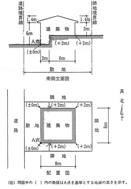 令2条1項6号より高さは地盤面からの高さとなる。よって平均地盤面を計算して