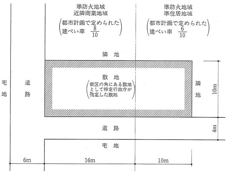 法53条3項二号より角地緩和が適用される。よって解答は3